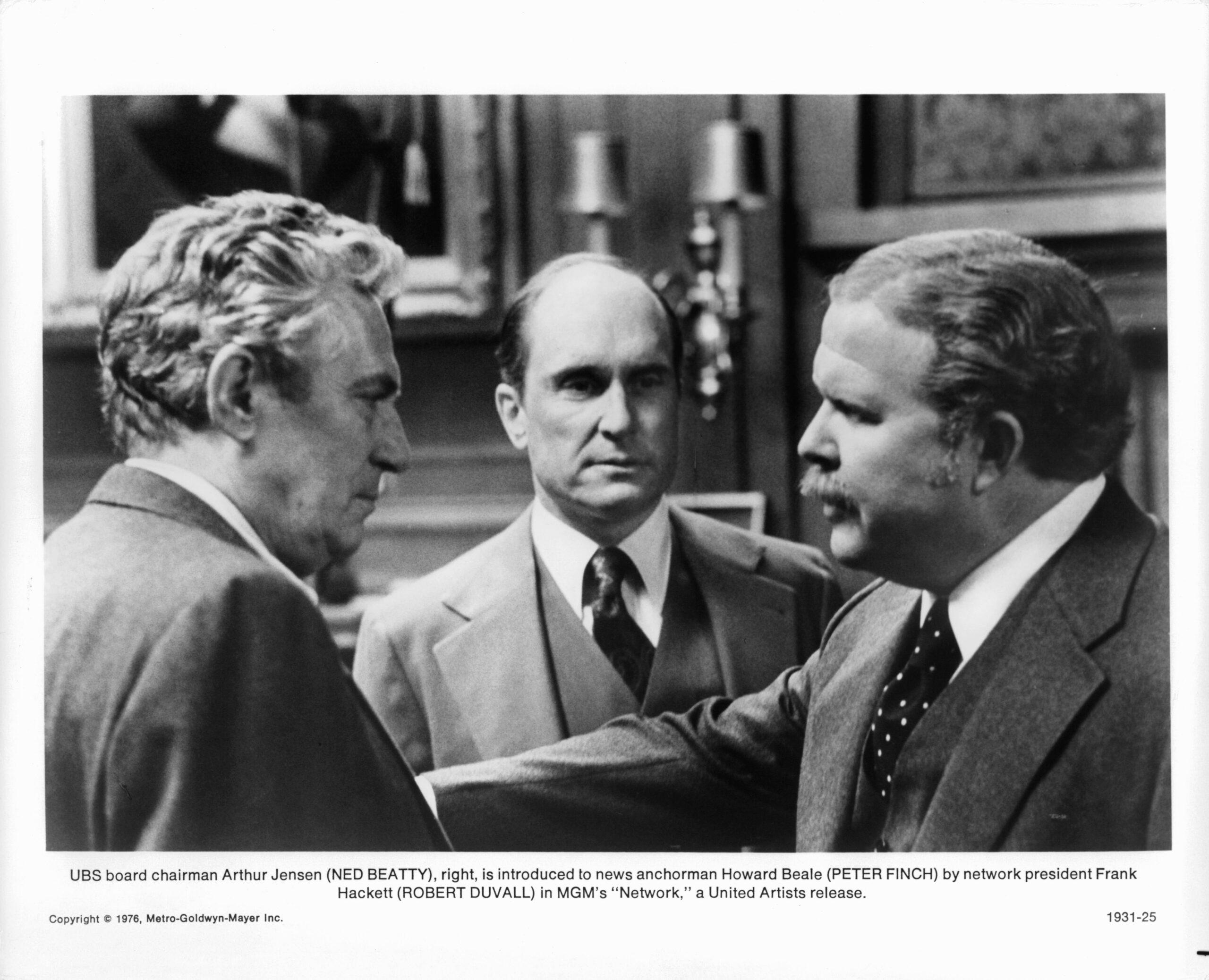 That is the easy jump, to correlate Trump — a beneficiary of reality TV and an increasingly voracious news media — with Beale and Chayefsky’s vision. But there is something else here, something more insidious. Network is a stunning and immersive ensemble story, with strands that twist through the station’s hierarchy, from the wearied president of the news division played by William Holden to Robert Duvall’s carnivorous corporate hatchet man. The movie ultimately turns on a figure of great import — Arthur Jensen, the chairman of CCA, the imaginary global corporation that has recently purchased UBS and supported Beale’s rise as a truth-telling TV sensation. Network is a movie made of big scenes and thunderous speeches — Chayefsky is a dialogic maestro who writes best for soloists — but there is one in particular that smacks of “Now!” It’s Jensen’s second (and last) scene, in which, after Beale torpedoes a deal between CCA and a Saudi Arabian conglomerate, the chairman delivers to the Mad Prophet an exegesis on the international system of wealth and influence: