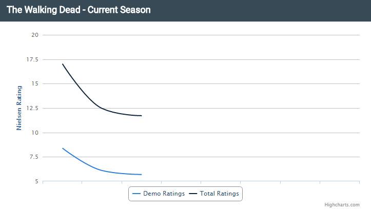 It’s indisputable that The Walking Dead has given back some of the ratings ground it gained over the past few years, and it wouldn’t be a surprise to see it sink still further on the heels of “The Cell,” which was almost as repetitive and unrelentingly bleak as the premiere. On the other hand, the series’s audience still dwarfs that of any other cable show. The only other Sunday series that comes close to rivaling its overall ratings, CBS procedural NCIS: Los Angeles, doesn’t do nearly as well in the demo, thanks to that network’s aged average viewer. To put The Walking Dead’s cultural imprint into perspective, its diminished audience this past Sunday was still more than seven times larger than the one for HBO breakout Westworld’s, according to Nielsen’s live numbers. Westworld, whose speculative leanings have fueled constant coverage, makes up some of that difference later in the week, although its audience is nowhere near The Walking Dead’s even after taking time-shifters into account.
