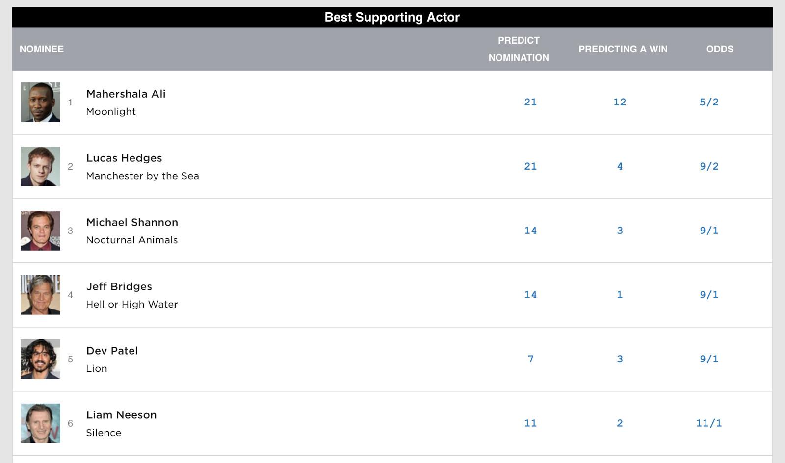 Given that no one has even seen Silence, this all feels premature, in both directions. Maybe Neeson is the second coming of Ben Johnson in The Last Picture Show, an old hand who is due and has come up with a sage, mature performance. Or maybe Silence is trash and Ali romps over the redheaded wiseass from Manchester by the Sea, Michael Shannon as a cranked-up Texas sheriff in a Tom Ford meta-thriller, and Jeff Bridges, who already won his Crotchety Old Guy Wearing a Cowboy Hat Oscar for 2009’s Crazy Heart.