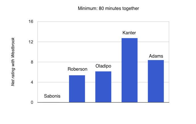 It hasn’t all been a smooth transition, though. Despite spending almost all of his time on the floor with Westbrook, he still has a net rating in the negative. Oklahoma City’s offensive rating is 0.6 points higher when he is off the floor, and the team’s defensive rating is 1.8 points lower when he is off it. Those wouldn’t be terrible numbers for a bench player, but Sabonis has played 229 of his 263 minutes this season with Westbrook, who has been almost single-handedly keeping the Thunder afloat. The Thunder have a net rating of plus-6.8 points when Westbrook is playing and a net rating of minus-21.3 points when he isn’t, and his minutes with Sabonis are a glaring exception to that pattern. Sabonis is one of only two players on their roster (along with Jerami Grant) who doesn’t have a positive net rating when paired with Westbrook.