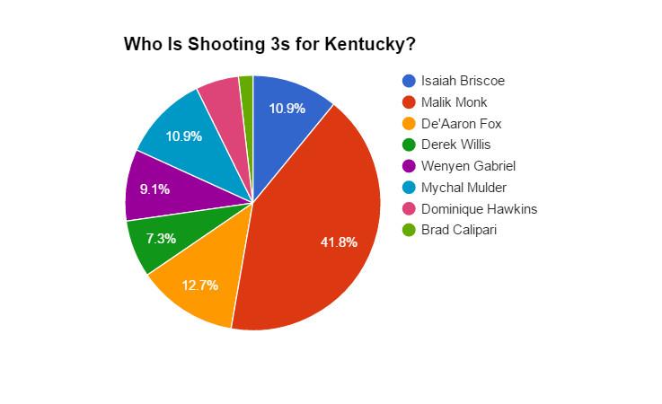 Through the first three games of the season — blowouts of Stephen F. Austin, Canisius, and Michigan State — Kentucky is shooting 29.1 percent from 3. Maybe even more important than the percentages is the distribution of attempts. Kentucky is depending on perimeter shooting primarily from freshman Malik Monk, who made seven 3s against Michigan State. Freshman De’Aaron Fox, Monk’s backcourt mate, is 0-for-7, while sophomore Isaiah Briscoe, the starting small forward, is 6-for-43 in his college career.