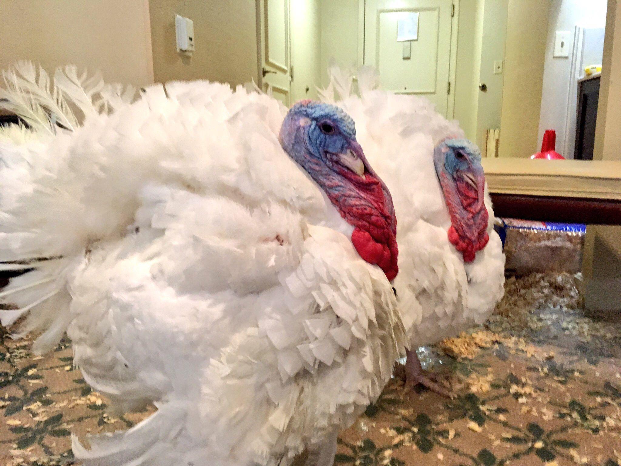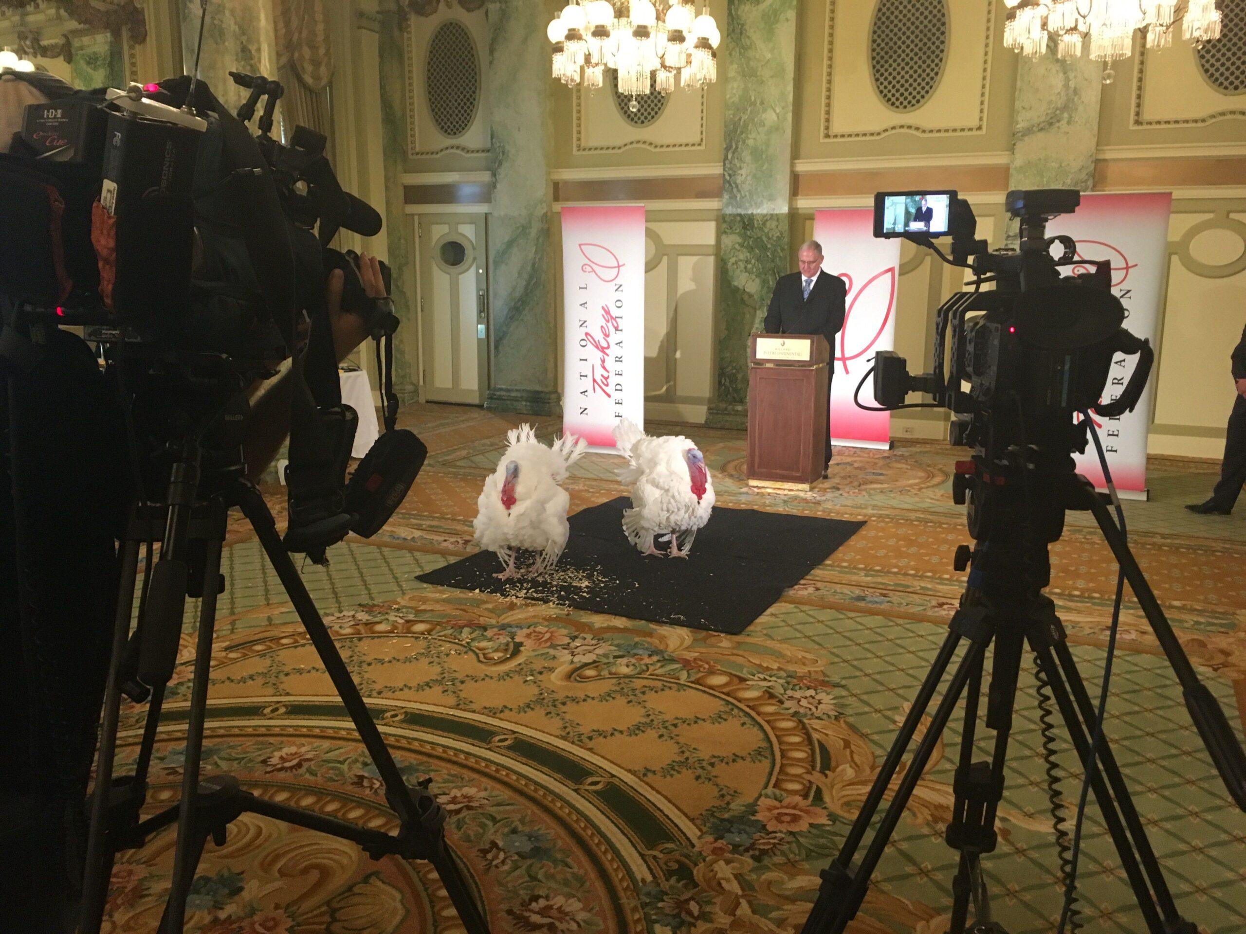 Tater and Tot were chosen for their beauty, and they are indeed very stately: Bright white with rear plumes of long, snowy feathers, they stalked across the Willard ballroom, in what Gruhl proclaimed was a turkey display of confidence, after their names were announced in an NTF press conference. The Willard’s executive chef approached, dressed in a white cook’s coat, and lightly prodded one before taking a picture with it.