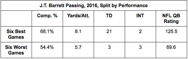 The below chart shows Barrett’s stats from his six best games this year (ordered by the NFL formula for passer rating) and the stats from his six worst. The first grouping includes games against the likes of Rutgers and Bowling Green, the second against the likes of Michigan and Wisconsin.