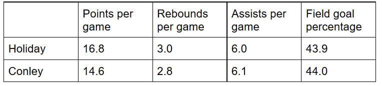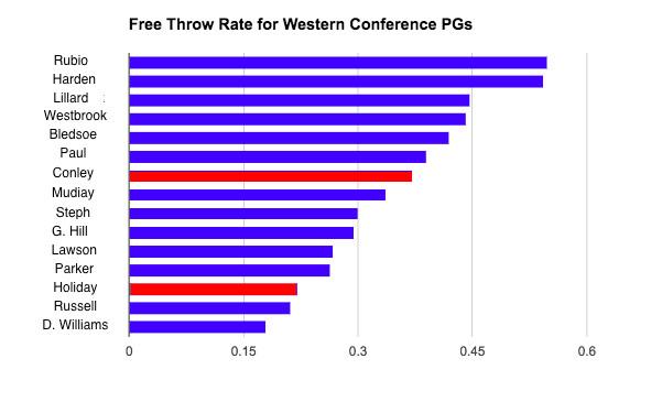 One of the biggest areas for growth for Conley over the past few seasons has been his ability to get to the free throw line, an area of the game where Holiday struggles, possibly due to the overall calmness he plays with. Because he can do everything so well, he takes what the defense gives him rather than trying to force the issue. Getting to the line generates extra points and increases a player’s overall efficiency, and also makes everyone else’s job easier because it gets the team over the foul limit earlier in the quarter, softening the defense in the process. Holiday has never averaged more than 3.3 free throws a game in his career, and he’s one of the worst at generating contact this season among starting PGs in the Western Conference: