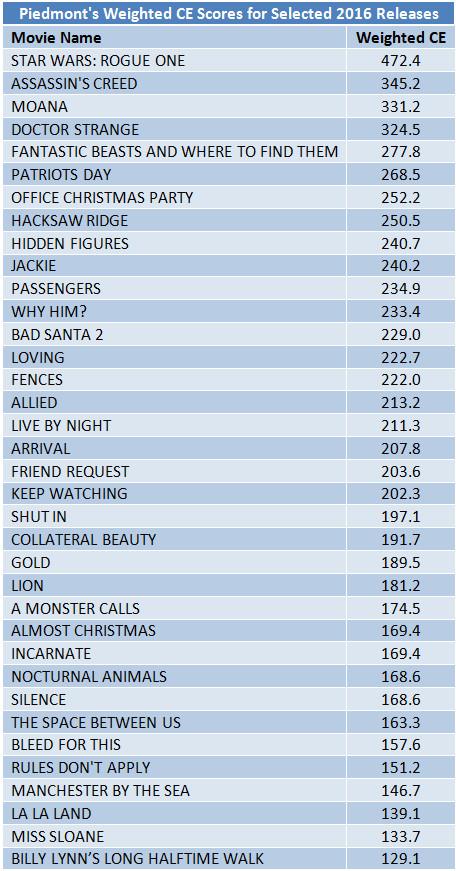 The interpretation of a movie’s CE score depends on its budget; a movie with a modest CE score that cost much less to make could be a bigger success, relative to expectations, than a film with a higher CE that was still dwarfed by its budget. A successful summer blockbuster should score at least a 250, a line of demarcation that separates Jason Bourne (370), Star Trek Beyond (364), Ghostbusters (338), and The Legend of Tarzan (292) from Warcraft (212), The BFG (204), and Ben-Hur (178). "Horror films tend to score higher than other genres in general," Lynn says, which backs up the Blumhouse formula; Don’t Breathe’s concept scored a 240, while Lights Out checked in at 214. Comedies also do well, although they’re especially volatile, suffering steep penalties when reviews report that they don’t deliver laughs. Dramas (130–160) and indie films (below 130) bring up the rear. Even Oscar notoriety can’t save some films with low CE scores; Whiplash (97) and Nebraska (74) didn’t cost much to make, but they weren’t windfalls, either.