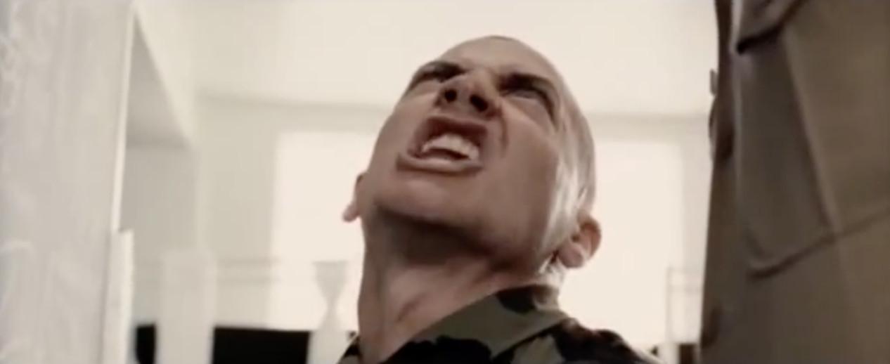He dips and dodges a few of the werewolf’s punches, delivers a few crushing blows, eventually happens across a knife, then stabs him a good 20–25 times. The werewolf pops up, they go at it again, then Spoon crushes him good in the head with a frying pan. As he stands over him preparing to give the werewolf a death blow, a second werewolf slaps the pan out of Spoon’s hand and then grabs him by the throat. He pins Spoon up against the wall and gets right in his face, snarling and drooling and making it very clear that he’s about to eat Spoon. So guess what Spoon does? He chews on his gum, looks the werewolf in the eyes, then says — and I promise to you he really actually says this — he says, “I hope I give you the shits, you fucking wimp.” (!!!!!!!!!!) You’re telling me I need a crazy guy in my platoon? Then I’m telling you to give me the one who ain’t afraid to box a werewolf and then cuss out a different werewolf.