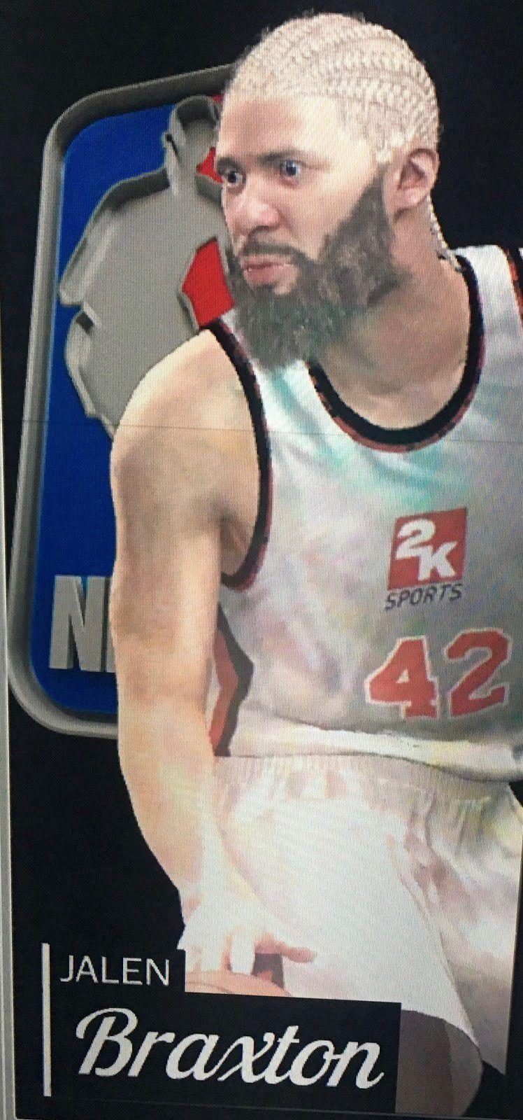 Braxton was created by the 2K engine in the virtual year 2025. Perhaps that’s why his overall vibe is “Simon Phoenix’s brother makes the NBA.” The algorithm styled his hair in braids, which … OK. But why are they platinum blond? He’s got a James Harden–esque beard, which does not match the color of the hair on his head. What about the name? One part familiar (Jalen Rose, Jalen Jones), one part novel, in the context of the league (there has never been an NBA player with the given or family name Braxton). He wears no. 42, a common enough basketball number — but it’s been retired only four times across the league. All of these details, taken together, go into creating the look and feel of a randomly generated player.