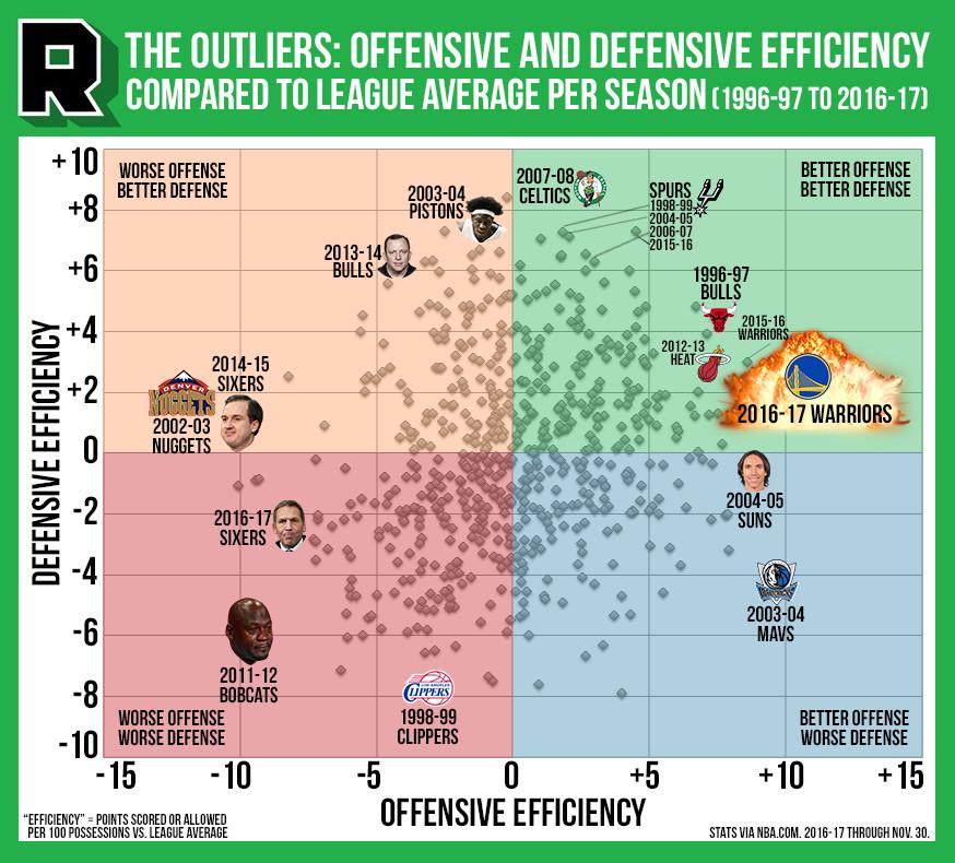 They’re outscoring the average team by 10.8 points per 100 possessions, which is the most since 1996 (the first year of available data from NBA.com). Compared to the average team, they’re playing defense about as well as LeBron’s 2012–13 Heat, but with offensive production that tops the Seven Seconds or Less Suns.