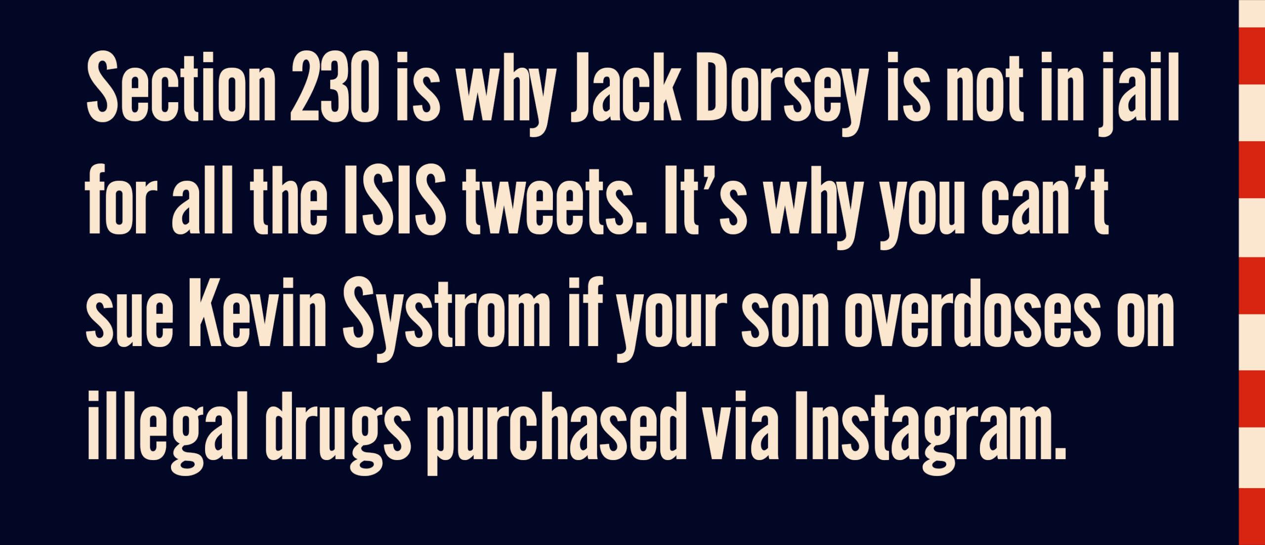 Section 230 is why Jack Dorsey is not in jail for all the ISIS tweets. It’s why you can’t sue Kevin Systrom if your son overdoses on illegal drugs purchased via Instagram. It’s the reason I can’t sue Evan Spiegel for harassment if a dude sends me unsolicited pictures of his dick on Snapchat.