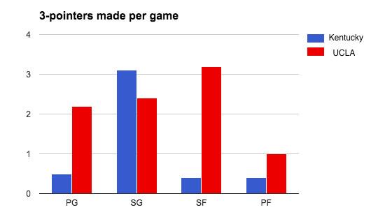 There’s a substantial difference in the amount of spacing provided by the Kentucky and UCLA offenses. In essence, Fox has to work a lot harder for his assists than Ball does. Here is a breakdown of how many 3-pointers each team generates, by position: