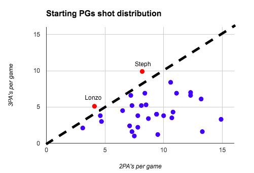 The result is a bizarre hybrid of an offensive player. Whether it’s by choice or necessity, Ball’s offensive game takes the logic of Moreyball to its ultimate conclusion. He takes more 3s per game (5.1) than 2s (4.1), a shot distribution pattern shared by only one starting PG in the NBA:
