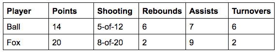 You have to be careful about jumping to too many conclusions based on one game, and Fox and Ball weren’t matched up against each other the entire game. When they were, though, Fox clearly got the better of Ball. It was easier for him to score and initiate the offense against Ball than vice versa. UCLA’s win was more due to brilliant individual performances from TJ Leaf and Aaron Holiday.