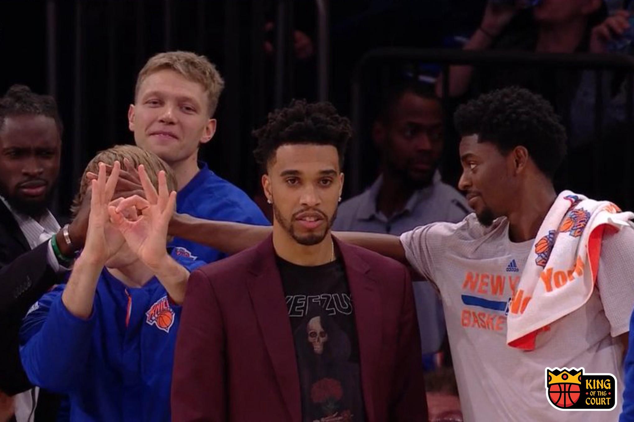 Instead, redirect your attention to courtside at Madison Square Garden. Courtney Lee did not play for the Knicks on Sunday night against an assemblage of men feigning interest in a basketball game — a.k.a. the mid-road trip Sacramento Kings — but his presence was felt. Still recovering from an ankle injury, Lee sat on the bench, cheering on his teammates. A quick perusal of the Knicks’ Twitter feed shows him celebrating all the times that New York embarrassed Sacramento in its 106–98 victory. Eventually he displayed the necessary enthusiasm to garner a few TV close-ups. It may not be obvious, but he was really excited to see Lance Thomas hit a 3 in the middle of the second quarter, and, in turn, I was really excited to see this outfit.