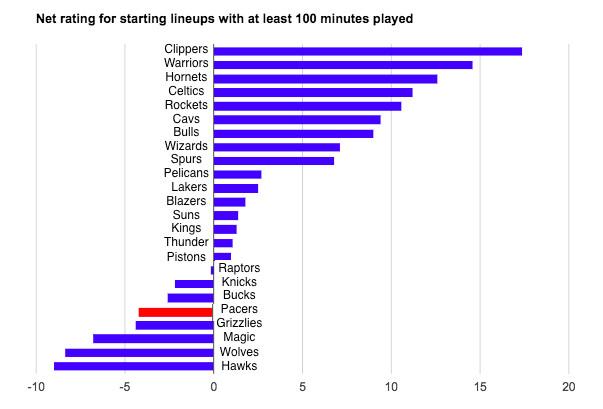 Their starting five of Teague, Ellis, George, Young, and Turner features four different players used to having huge roles on offense. It’s a fantasy basketball lineup come to life, but has been a group worth less than the sum of its parts through the first quarter of the season. Among NBA starting lineups with at least 100 minutes played this season, Indiana’s five-man starting unit has the fifth-worst net rating: