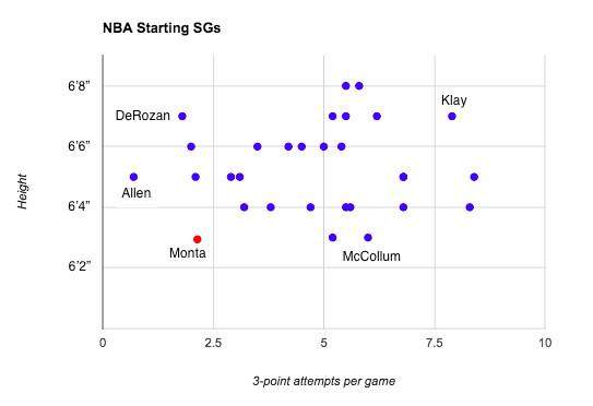 A lack of size and shooting ability is a tough combination for a shooting guard. The players at Ellis’s position who shoot fewer 3s a game are either defensive specialists like Tony Allen or supersized guards who live at the free throw line like DeMar DeRozan. The shooting guards who excel despite their lack of size are either gunners like C.J. McCollum, who make a living bombing 3s, or elite athletes like Avery Bradley, who can defend both backcourt positions. For most of his career, Monta has carved out a niche for himself by being a de facto point guard, distributing the ball and getting to the rim at will. However, at the age of 31, he’s no longer as explosive as he was in his prime, and he doesn’t have the secondary skills necessary to excel in a smaller role. Monta is an all-or-nothing player, and it’s hard for him to help a team if he can’t be a primary option. He has a usage percentage of only 16.4 this season, almost nine points lower than his career average of 25.2.