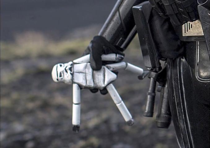 The scuffed-up doll just dangles, its legs and arms akimbo. Even so, it might have the most backbone of any Stormtrooper who appears in Rogue One. No single Star Wars movie — maybe not even the entire preexisting series combined — has shown us so many Stormtroopers biting it in so many painful ways. Bashed in the head by a droid? Check. Battered by the bodies of other unconscious Stormtroopers? Check. Poked and bonked by a staff wielded by a blind man? Roger roger.