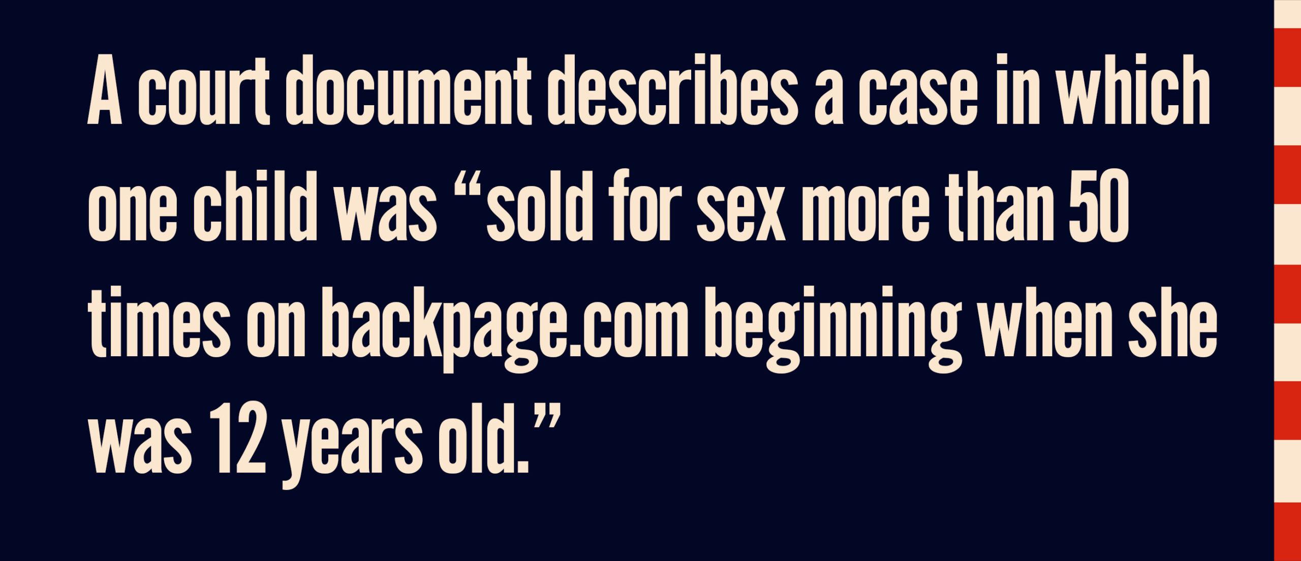 The nonprofit views Backpage as so tightly tied to the sale of children for rape that the website is now the first place it searches for children reported missing. In a 2016 amicus brief, the organization outlined the ways in which it believes that Backpage has been deliberately optimized to keep the child trafficking industry going, including having relaxed posting rules for escort ads while requiring other sellers to provide valid telephone numbers. It also describes a case in which one child was "sold for sex more than 50 times on backpage.com beginning when she was 12 years old." The organization has worked on more than 420 cases in which children were trafficked through Backpage.