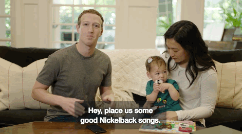 Now, for some comedy: Morgan Freeman’s disembodied voice is asked to play “some good Nickelback songs.” He cannot, he explains, because they don’t exist. This is where we really get a glimpse of Mark Zuckerberg’s acting chops. He gets it. He is in on this joke.