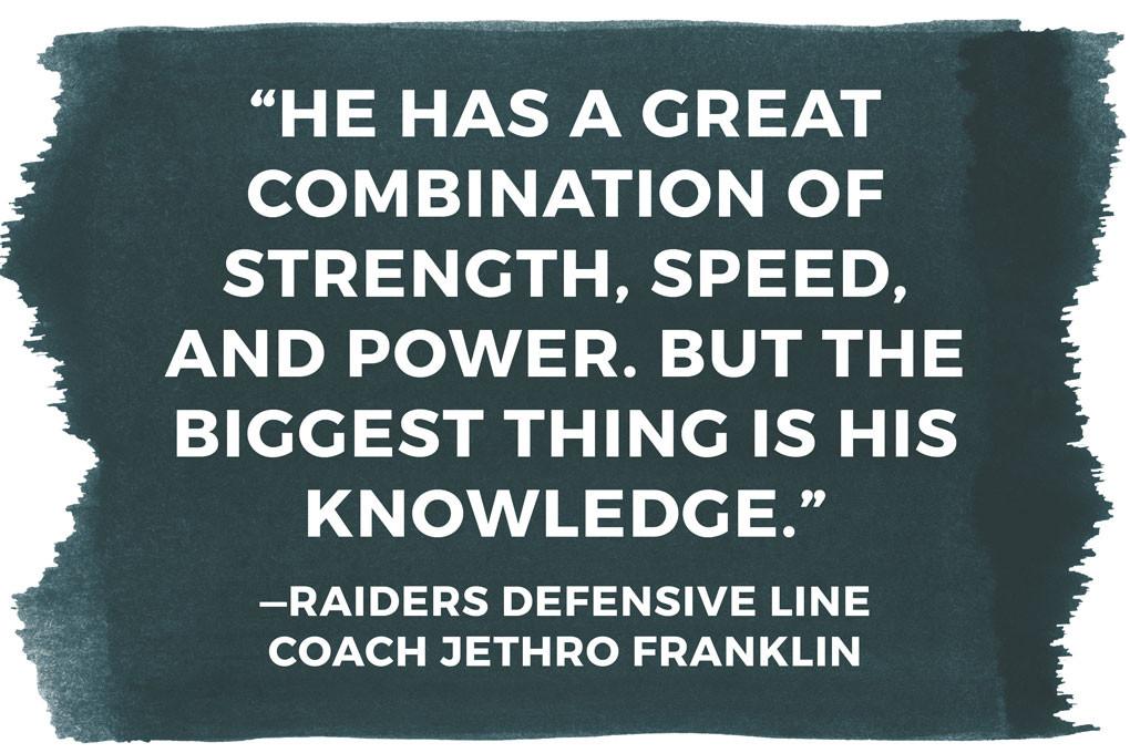 "He knows the angles, he knows which arm to reach out with based on where the quarterback likes to hold the ball, he knows exactly at what depth the quarterback will be," says Raiders defensive line coach Jethro Franklin. "He knows how many steps their drops are, their setup points. He has a great combination of strength, speed, and power. But the biggest thing is his knowledge."