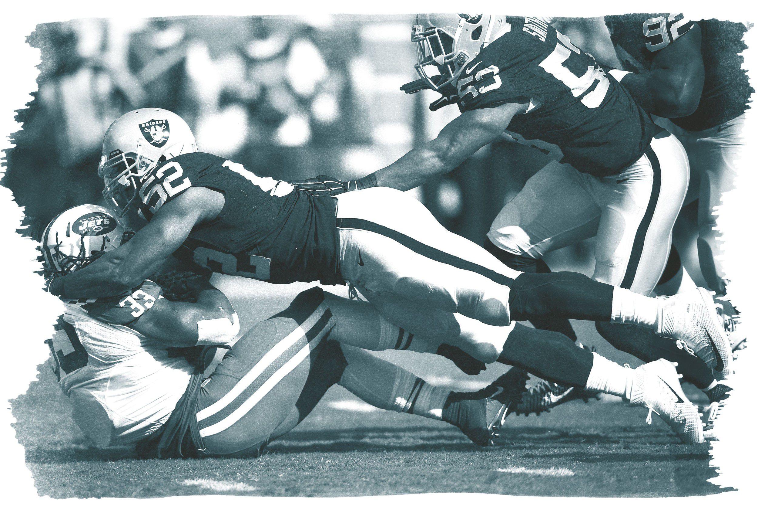 Franklin, the Raiders’ defensive line coach, says that Mack is the perfect pass rusher for this era. For one, offenses are enjoying unprecedented levels of success, with the average quarterback throwing for 242 yards per game, up 18 percent from a decade ago. The best way to slow the competition in a league full of unstoppable offenses is to take the ball away from them. What’s more, Mack’s knack for pursuing the perfect angle tends to help him avoid the curse that afflicts many modern pass rushers: the dreaded helmet-to-helmet hits, however accidental, that often net 15-yard penalties. "You can’t punish the quarterback like you used to," Franklin says. "You can go for the big hit now and it’ll probably be helmet-to-helmet anyway and you won’t even end up with a sack. Khalil is not looking for a kill shot."
