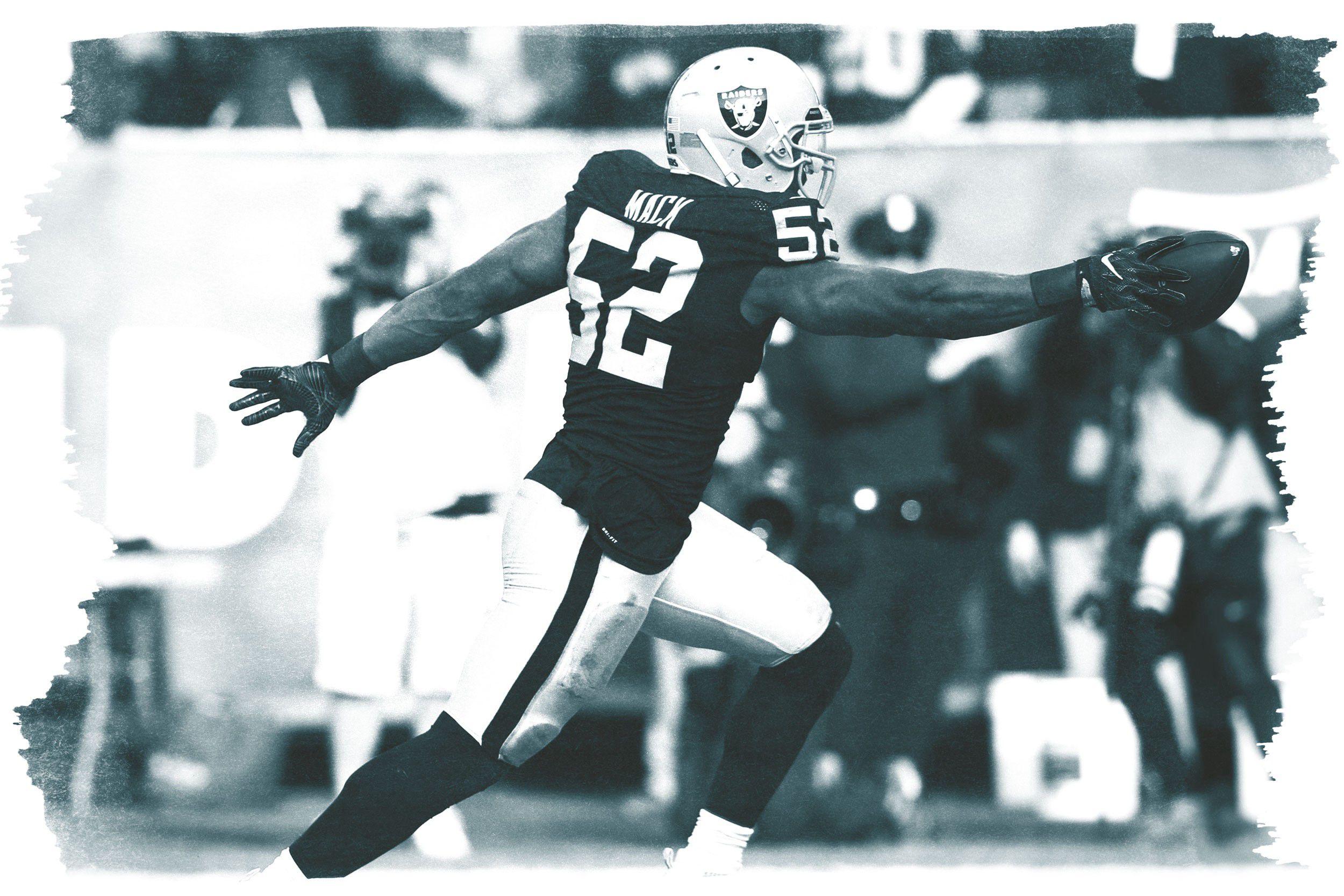 Tepper isn’t the only one from whom Mack seeks council, because the thirst for constant improvement that Sandy instilled in his son at a young age has never diminished. Raiders great Woodson was still active during Mack’s first two seasons, and Mack says that he’d seek advice from the franchise hero, who taught him how to tackle with the intent of stripping the ball by putting pressure on the ball carrier’s shoulder. (Mack demonstrated the shoulder technique on this reporter, who can confirm its effectiveness.) Remember: For Mack, it’s not about the big hit, but the right hit. "I’m looking for leverage in my hits," Mack says when describing his tackling philosophy today. Oakland defensive tackle Dan Williams says that Irvin, the former Seahawk who joined the Raiders over the summer, has given additional lessons to Mack and the team’s other pass rushers on how to hit the elbow during the tackle, a tactic Irvin says Mack is employing well. Mack’s five forced fumbles this season are two more than he managed in his first two seasons combined.