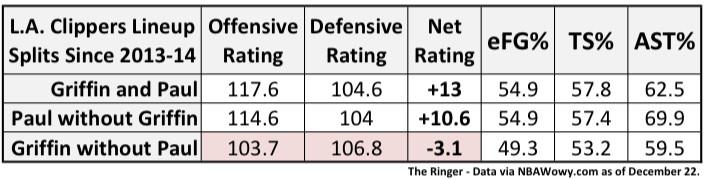 In the Doc Rivers era (since 2013–14), in the regular season and playoffs combined, the Clippers score 117.6 points per 100 possessions when Paul and Griffin are both on the floor, per NBA Wowy. That drops to 114.6 when Paul is on without Griffin, but it plummets to 103.7 when Griffin is on without Paul. Here’s a more detailed look: