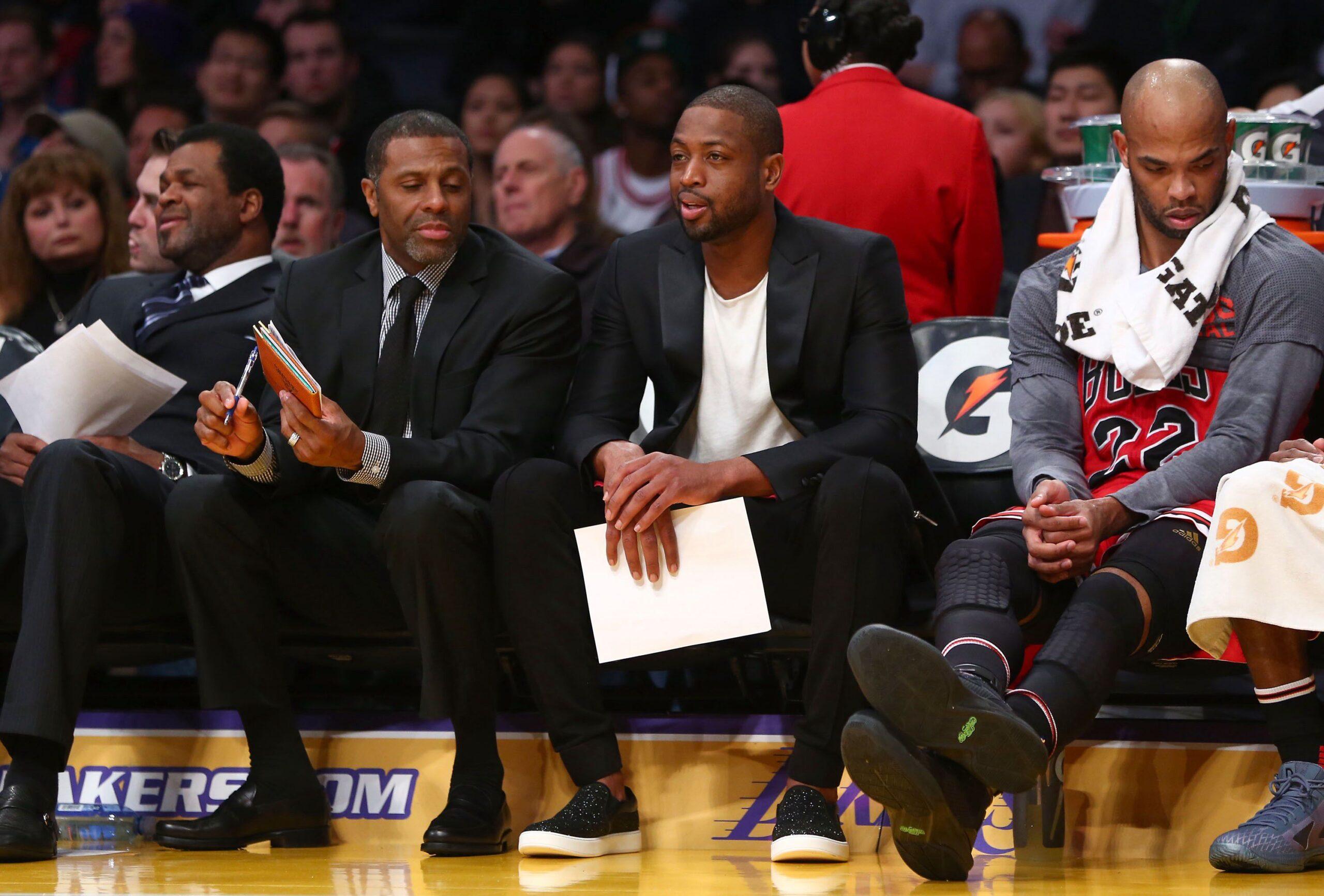 Courtney’s jacket-and-T-shirt look has been prominently worn by fashion aficionado Chandler Parsons and occasional pariah D’Angelo Russell during their respective prolonged injury DNPs. Perhaps Lee was inspired to ditch the dress shirt by his own teammate, Joakim Noah. All three of these guys manage to convey that they’re doing us some kind of favor. Sure, there’s a dress code to meet, but nothing can contain their needs for style, for comfort, for personality. And then there’s Dwyane Wade. If he’s going T-shirt and jacket, he will do so with only the richest fabrics and sparkly shoes.