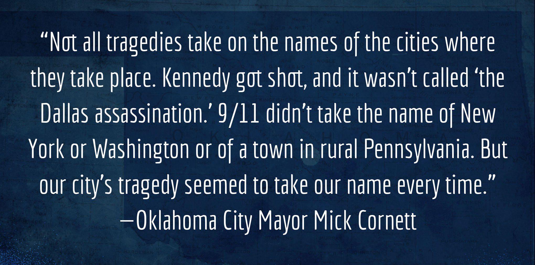"We allowed ourselves to be defined by that tragedy," says Cornett. Oklahomans refer to the event as the "Murrah bombing." Elsewhere, though, the city’s name became shorthand for the attack. Says Cornett: "Not all tragedies take on the names of the cities where they take place. Kennedy got shot, and it wasn’t called ‘the Dallas assassination.’ 9/11 didn’t take the name of New York or Washington or of a town in rural Pennsylvania. But our city’s tragedy seemed to take our name every time."