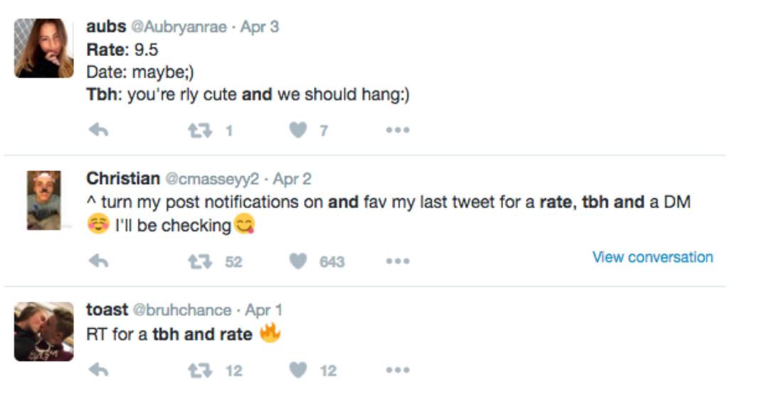 Tbh lives outside of Facebook Live as well. On Instagram and Twitter, popular hashtags include #tbh4tbh (similar to #like4like), #tbhrate, #tbhpics, #tbhratedate, and #tbhandrate. The list goes on and on and on, but the tags convey the same thing: Please look at this live stream, video, or photo of me and tell me what you think.