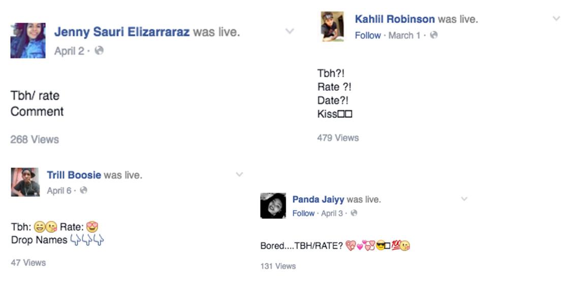 “Tbh and rate” is a request to be rated on a scale, usually of 1-10, mostly about how good or bad looking you are, or just how cool you are. Sometimes it’s shortened to “tbh” or “tbh rate, date” or “tbh rate, date, pass” — you get the idea. On Facebook Live, teens mostly stare at the camera or engage in mundane activities while waiting for and responding to ratings.