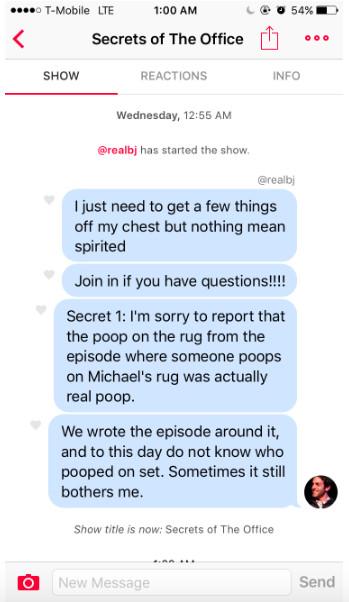 Knowing in my heart that B.J. approved, I changed my profile picture to a screenshot of his face. I changed my name and handle to “BJ Novak.” And then I started a “chat” called “Secrets of The Office.” Then I made up some secrets about The Office.