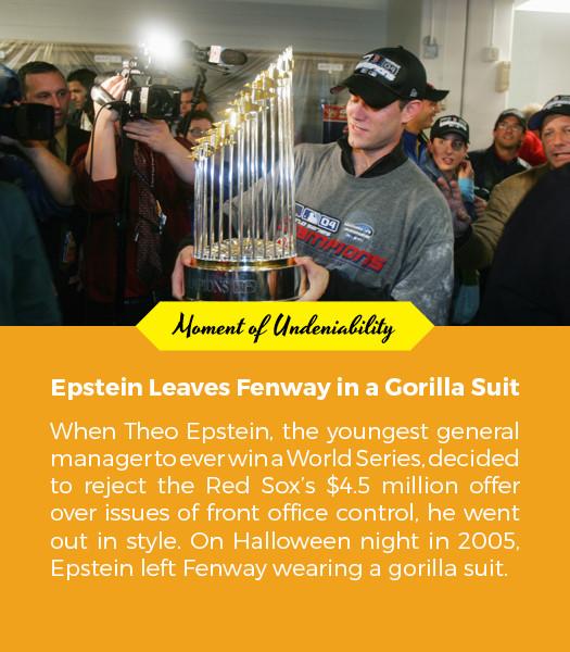 You know the rest: the comeback against the Yankees, the sweep of St. Louis and a broken 86-year-old curse, Epstein’s shocking resignation a year later when he dodged reporters by wearing a gorilla suit out of Fenway Park. It was Michael Jordan’s first retirement, for the Moneyball era. Then came the (ultimately false) rumors that he’d been following Pearl Jam around South America, followed by reconciliation between Epstein and the team, the Daisuke Matsuzaka signing, and a second title in 2007.