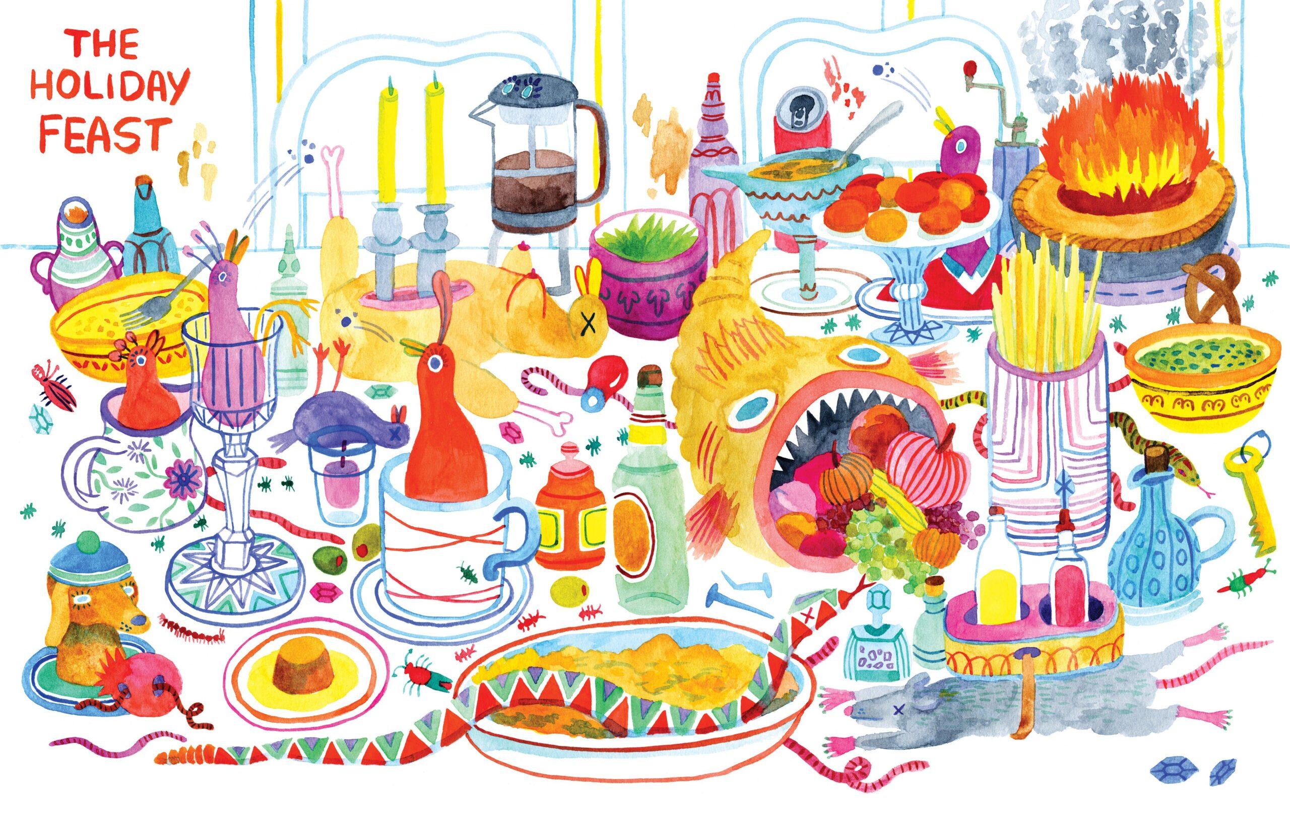 BoJack’s third season, a typically potent mix of visual joy and emotional cynicism, comes immediately on the heels of Hot Dog Taste Test, Hanawalt’s second stand-alone collection of drawings. The book is loosely centered on food, anchored by a handful of illustrated essays Hanawalt made for the foodie quarterly Lucky Peach on topics ranging from New York street food to Las Vegas hotel buffets. The culinary theme isn’t universal, Hanawalt says, but it’s a useful organizing principle. “It kind of helps people understand my work if they haven’t seen it before,” she says. “They’re like, ‘What is this? Dogs? Cats?’ It’s almost like a Trojan horse. It’s about food, but there’s also birds trying on swimsuits and stuff that kind of relates to life.”