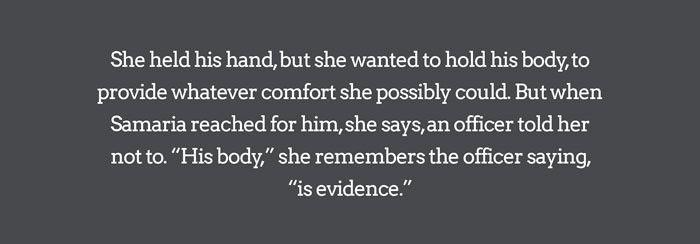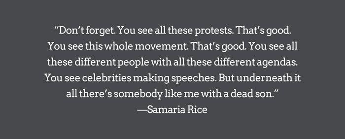 "Don’t forget," says Samaria. "You see all these protests. That’s good. You see this whole movement. That’s good. You see all these different people with all these different agendas. You see celebrities making speeches. But underneath it all there’s somebody like me with a dead son."