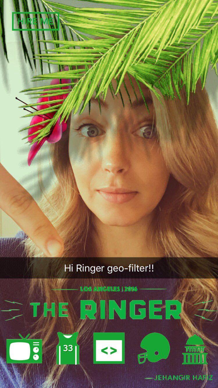 In May, in the weeks leading up to our official launch, an eager and talented fan named Jehangir Hafiz sent us an email. He’d created a geofilter for The Ringer. He didn’t ask us, so it’s not like we could give input on the design that anyone near the premises of our offices could swipe and see — but it did have our logo. Because of that, it certainly felt very official; anyone who didn’t know it wasn’t created by our team could easily assume it was. What if we didn’t want our location publicized? (This wasn’t the case, of course, and we thought the filter was cute; we used it. It was very nice of Hafiz!) not everyone is so happy to have their location outed via Snapchat swiping, or to have their branding used with an unapproved design.
