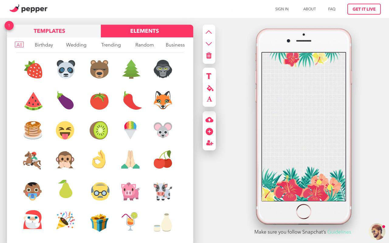 But there is a way to turn this side gig into a full-time project: hire designers, create a workflow, bring in clients, and have a full-fledged system to process requests, payment, and submissions. It’s exactly what Daniel Wyb and Brennen Belich have done. The duo recently launched Pepperfilters, a platform where anyone can use the drag-and-drop interface to create a design and then pay the company to turn it into a file the user can then submit to Snapchat — or pay a little more to have Pepperfilters take care of the whole shebang for them.