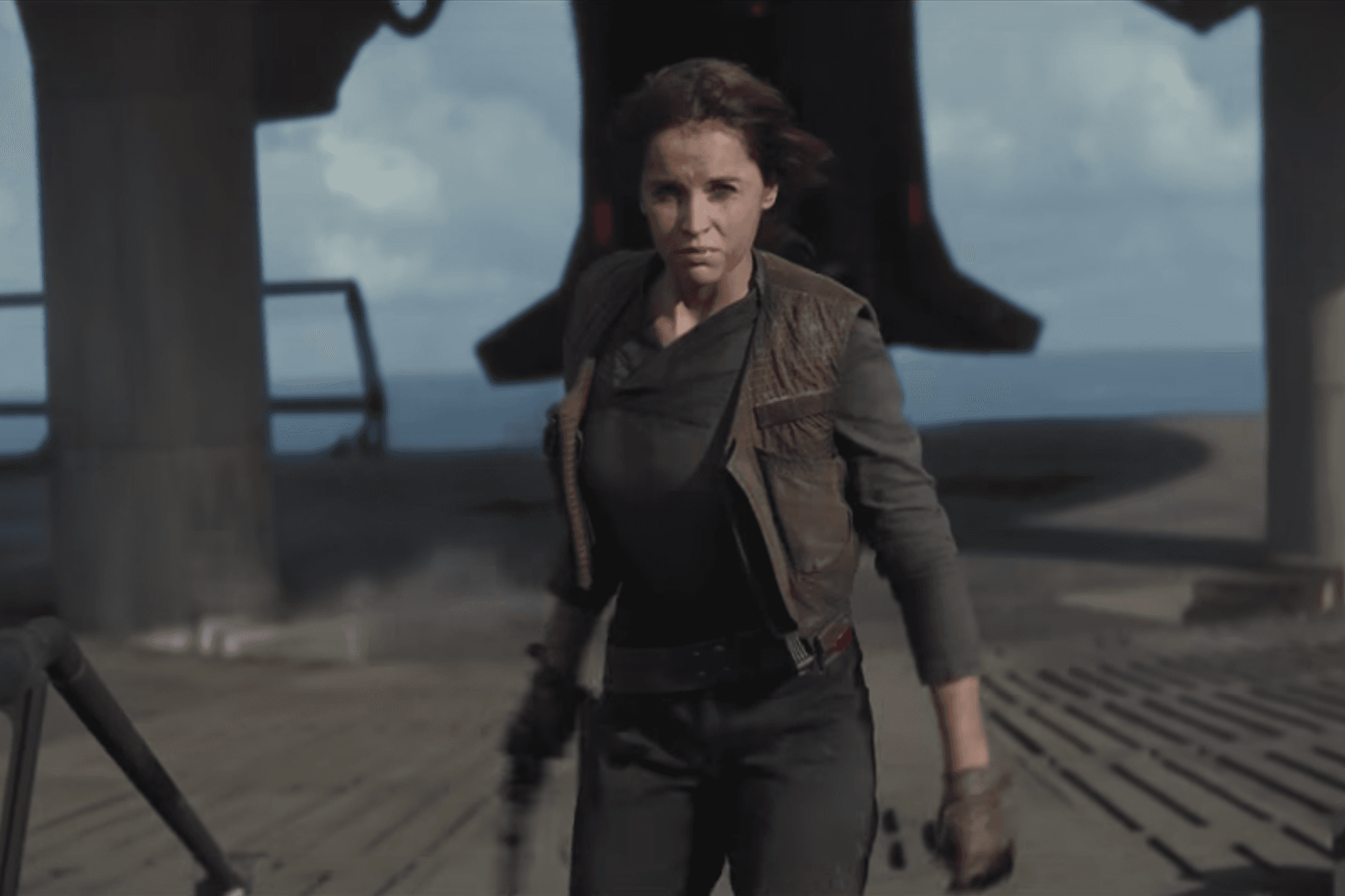 Whereas the teaser introduced Jyn as a streetwise lone wolf, trailer no. 2 presents her as part of a team, playing up the comradery (and maybe more) between Jyn and rebel recruiter Cassian Andor (Diego Luna). It also ends on a less somber note. The first trailer left us with the image of an anxious-looking Jyn dressed in the threads of an Imperial pilot, as Gerrera’s voice-over warns her about the danger of embodying the evil she’s trying to defeat. This time around, we cut to black (for the first time) on a confident, almost-smiling Jyn wearing rebel duds and backed up by badass allies on a lived-in-looking drop-ship.