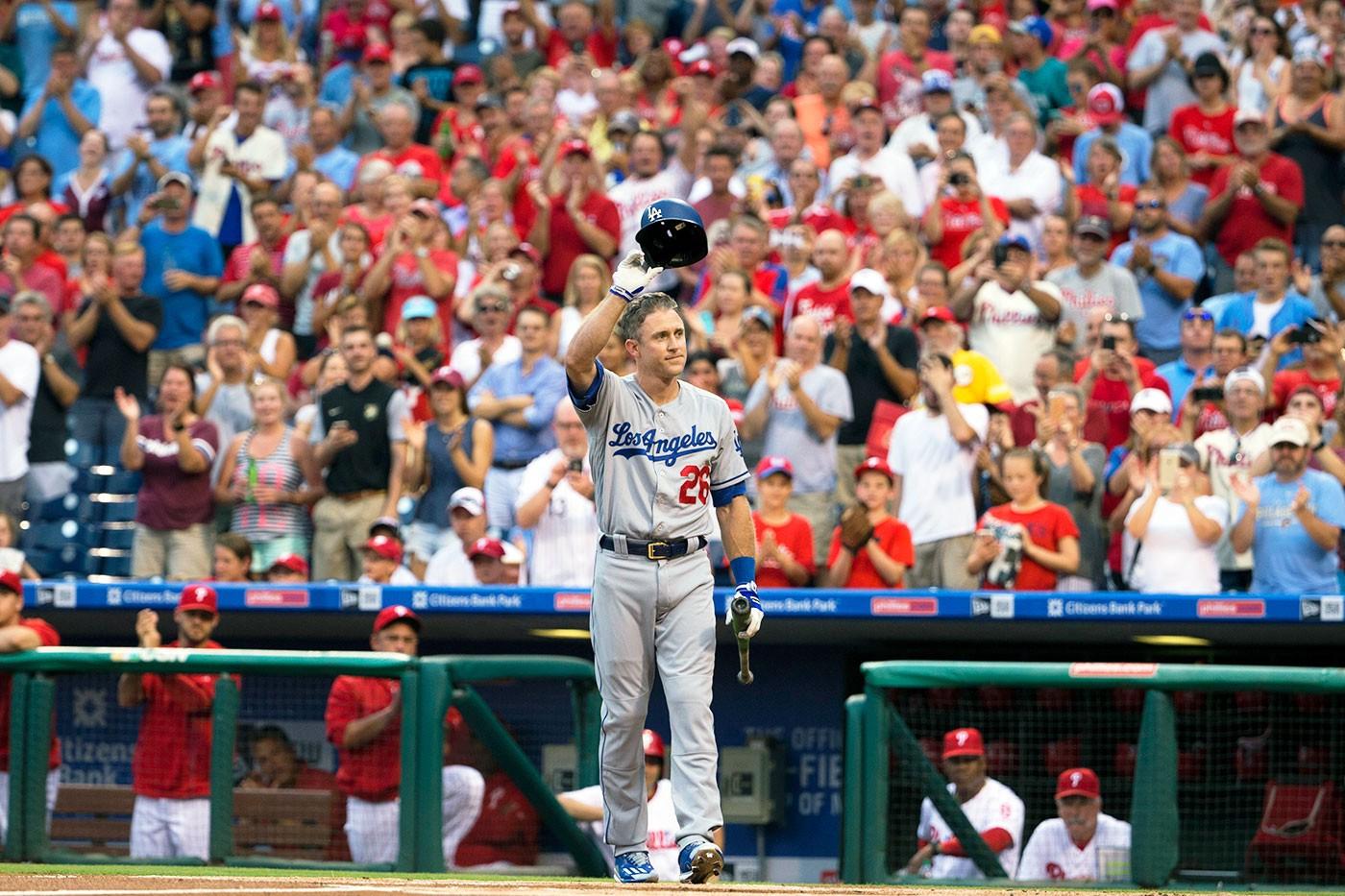 On Tuesday night, Chase Utley returned to Citizens Bank Park for the first time since he was traded to the Dodgers last August. All season, the Phillies hyped his visit: August 16–18, Philadelphia versus Los Angeles, Chase Cameron Utley, get your tickets now. When the second baseman walked up to the plate to lead off the game, this time wearing blue, he was serenaded with a 90-second standing ovation. He tipped his batting helmet and pointed to the fans, who quieted down seemingly only when they ran out of air. Utley then proceeded to knock the home team around en route to the Dodgers’ 15–5 victory: first with a solo home run in the fifth inning, and then with a grand slam in the seventh. Phillies fans weren’t bothered by the treatment. He got a curtain call after both.