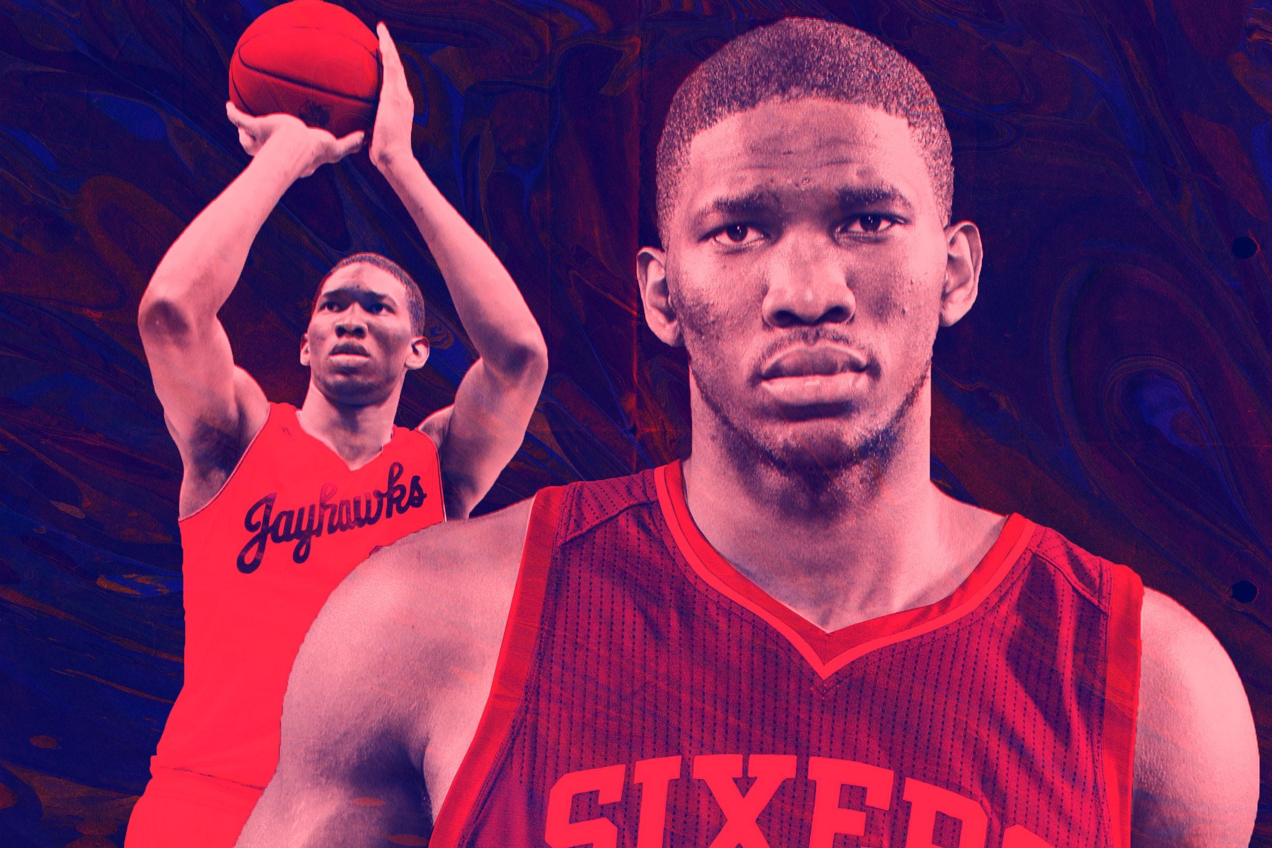 Patience will be required once Embiid returns to the court. He’ll need to chisel through the two and a half years’ worth of rust. He’ll need to adapt to playing against men of NBA size and athleticism after spending so much of his rehab applying his skills against trainers half his size. And once his body is ready for the rigors of the NBA, he’ll have to compete for playing time in the Sixers’ frontcourt logjam. The past two years of scrutiny belies the fact that Embiid is still just a baby by developmental standards; he started playing organized basketball only in 2011. The beginning of his rookie season could unfold like his freshman year at Kansas. Though Jayhawks head coach Bill Self compared Embiid to “a young Hakeem Olajuwon,” the big man was brought along slowly. Self kept Embiid’s bench role as a deterrent at the rim and a rebounding presence simple. But he was a sponge learning behind the scenes and quickly became a vital two-way contributor. That’s when it was apparent that Embiid, more so than his celebrated teammate Andrew Wiggins, was the transcendent prospect on the Jayhawks.