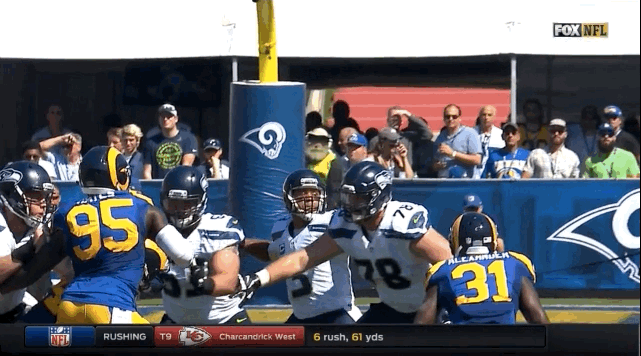 In the team’s first regular-season game in its temporary new home at the Coliseum, Los Angeles’s front four eviscerated the Seahawks’ offensive line as part of a 9–3 victory. Already hobbled with an ankle sprain suffered on a sack from the Dolphins’ Ndamukong Suh in Week 1, Wilson was sacked twice more (Robert Quinn got to Wilson a third time, but the play was negated by offsetting penalties) and hit nine times in total. Aaron Donald laid waste to Seattle’s guards; Quinn, meanwhile, will likely haunt the dreams of Seahawks left tackle Bradley Sowell for a while.