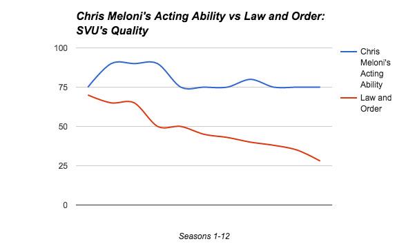 I get it. Sometimes actors want to leave popular beloved television shows, even when they get to banter with the lovely Mariska Hargitay for a paycheck. It’s entertainment for us, but a grind for them. Twelve years is a long time to do one thing, especially when that one thing is starring on pulpy trauma porn, no matter how wildly entertaining it is. Also, here is a graph I made comparing Christopher Meloni’s acting skill to the quality of Law and Order: SVU: