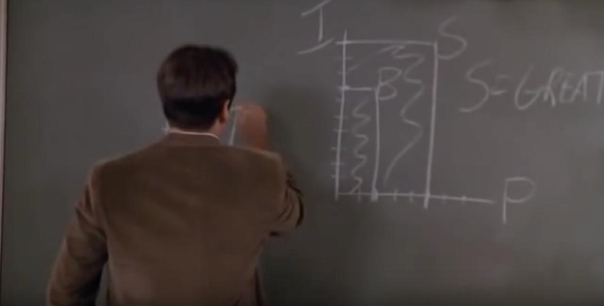 Early in Dead Poets Society, there’s a scene where Robin Williams’s character, John Keating, introduces his class to poetry. To do so, he has one of his students read a section of the introduction of a fictional book called Understanding Poetry. The introduction describes a chart that works as a literal blueprint for measuring the greatness of a poem. As the boy reads, Keating draws what’s being said. Here’s what he ends up with: