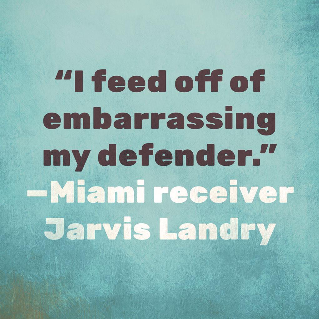 Landry craves contact in a way that is not only rare for receivers, but is, in fact, more in line with the position group he matches up against: "There aren’t receivers who have that mentality," says Dolphins safety Bacarri Rambo, a former Georgia Bulldog who played against Landry in college. "It’s a defensive back mentality." Dolphins head coach Adam Gase also sees similarities between his star offensive player and most teams’ feared defenders: "In the same way if you have a hard-hitting safety or linebacker, defenses are aware of where Jarvis Landry is," Gase says.