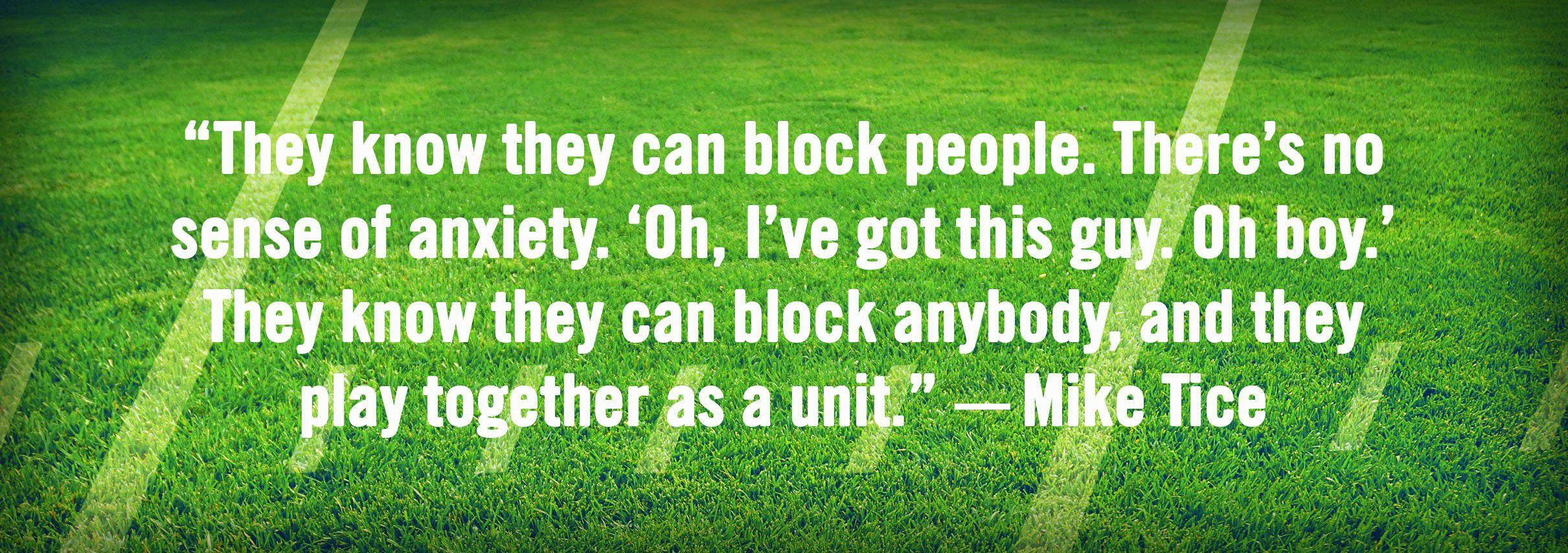 Three weeks ago, their goal of realizing Oakland’s Super Bowl dreams felt within reach. But since the injuries to Carr and Penn, talk of the Raiders’ championship hopes have dwindled; their odds of winning the title sit at plus-6,600, according to one Vegas sportsbook, tied for ninth among the 12 teams in the playoffs. According to Tice, though, what separates this group from others around the NFL is the unflinching belief the linemen have — in one another and in themselves — regardless of circumstance. “They know they can block people,” Tice says. “There’s no sense of anxiety. Oh, I’ve got this guy. Oh boy. They know they can block anybody, and they play together as a unit.”
