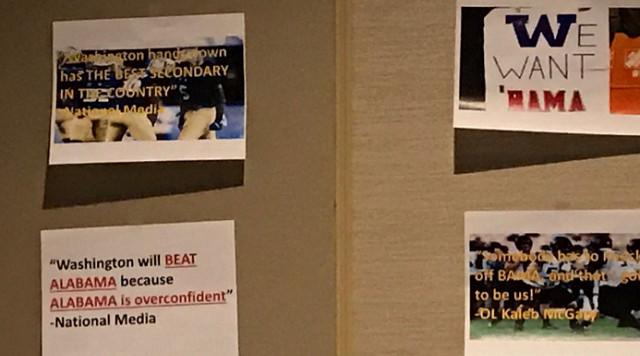 Before Alabama’s College Football Playoff semifinal matchup with Washington, a picture allegedly of Alabama’s locker room bulletin board surfaced. It contained various negative quotes from clippings about the Crimson Tide, including one that said “Washington will BEAT ALABAMA because ALABAMA is overconfident,” a quote attributed to “National Media.”