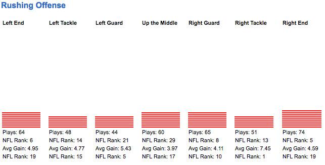 Shanahan’s offense gave new meaning to the idea of using the whole field. The run game in particular was pretty much devoid of tendency. Look at the play-direction report for their rushing offense, via NFL GSIS stats tracking: