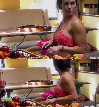 She’s standing in front of some fruit with a knife, suspiciously looking around. It was good work by the show’s editors. They had a segment of Liz talking about a secret, found a clip of Liz looking as if she had something to hide, and matched them up perfectly.