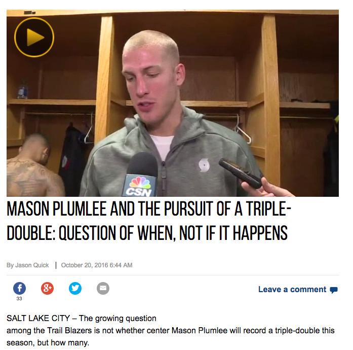 But, forget all that. The Cavaliers will be fine. The Blazers are, more or less, who we thought they were. Let’s talk about one of my favorite subplots of this already-great NBA season. Let’s talk about the Mason Plumlee Triple-Double Watch. On October 20, 2016, as the preseason was winding down, I clicked on the following story, which hit my eyeballs like a drone strike: