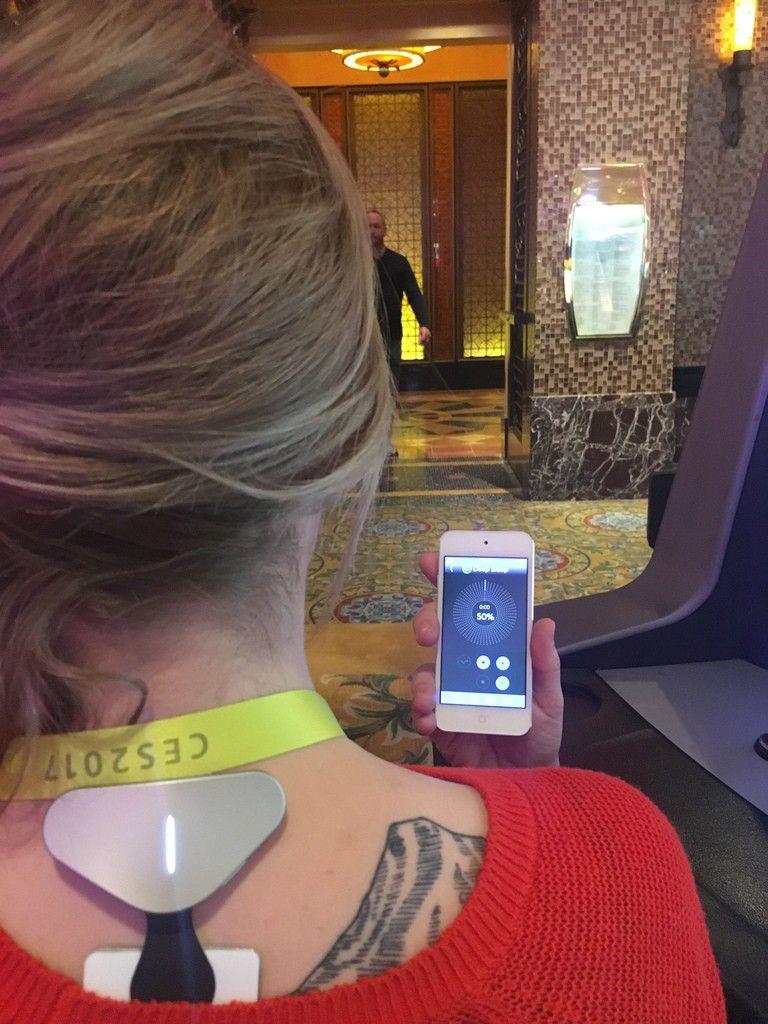 There in the casino, Goldwasser stuck the device to the back of my neck, and told me to wander the floor for a while to feel it working. I walked up and down the frenetic floral red carpets, feeling gentle zaps against the base of my neck, up to my skull. I liked it. The little buzzes were like gentle brain massages, and I imagined them tweaking my nervous system to manipulate me into relaxation.