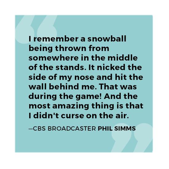 Phil Simms (CBS broadcaster): I remember a snowball being thrown from somewhere in the middle of the stands, and I was turning to my right, looking at Greg Gumbel, and for some unbelievable reason, I saw the snowball coming at me and moved my head just a little. It nicked the side of my nose and hit the wall behind me, and it was like a grenade just went off. That was during the game! And the most amazing thing is that I didn’t curse on the air, because it was an ice ball. And I thought, “If that thing would have hit me in the face, it would have definitely knocked me out.”